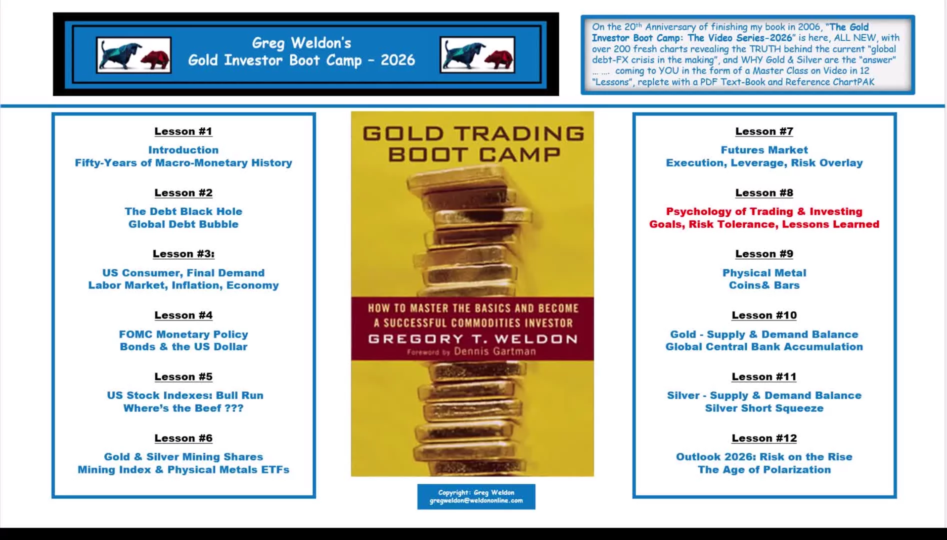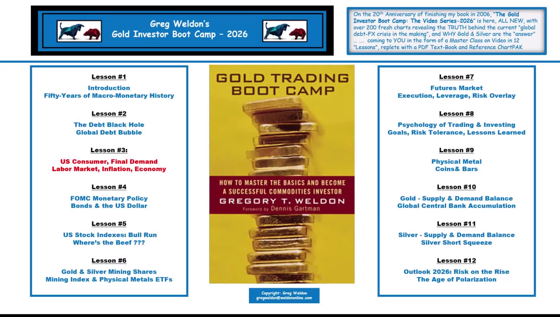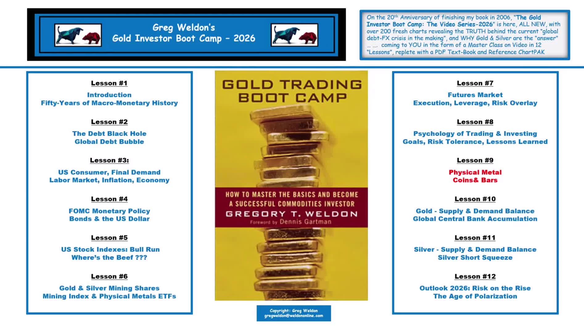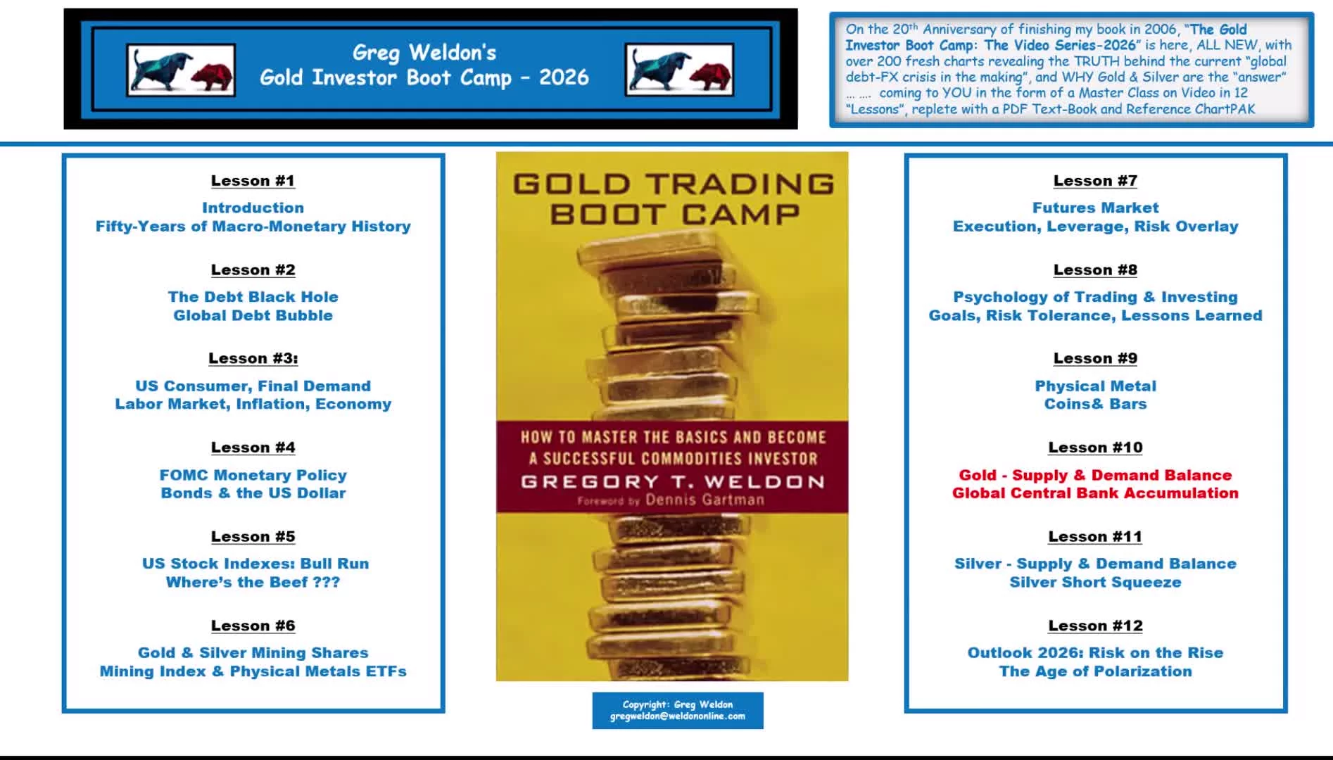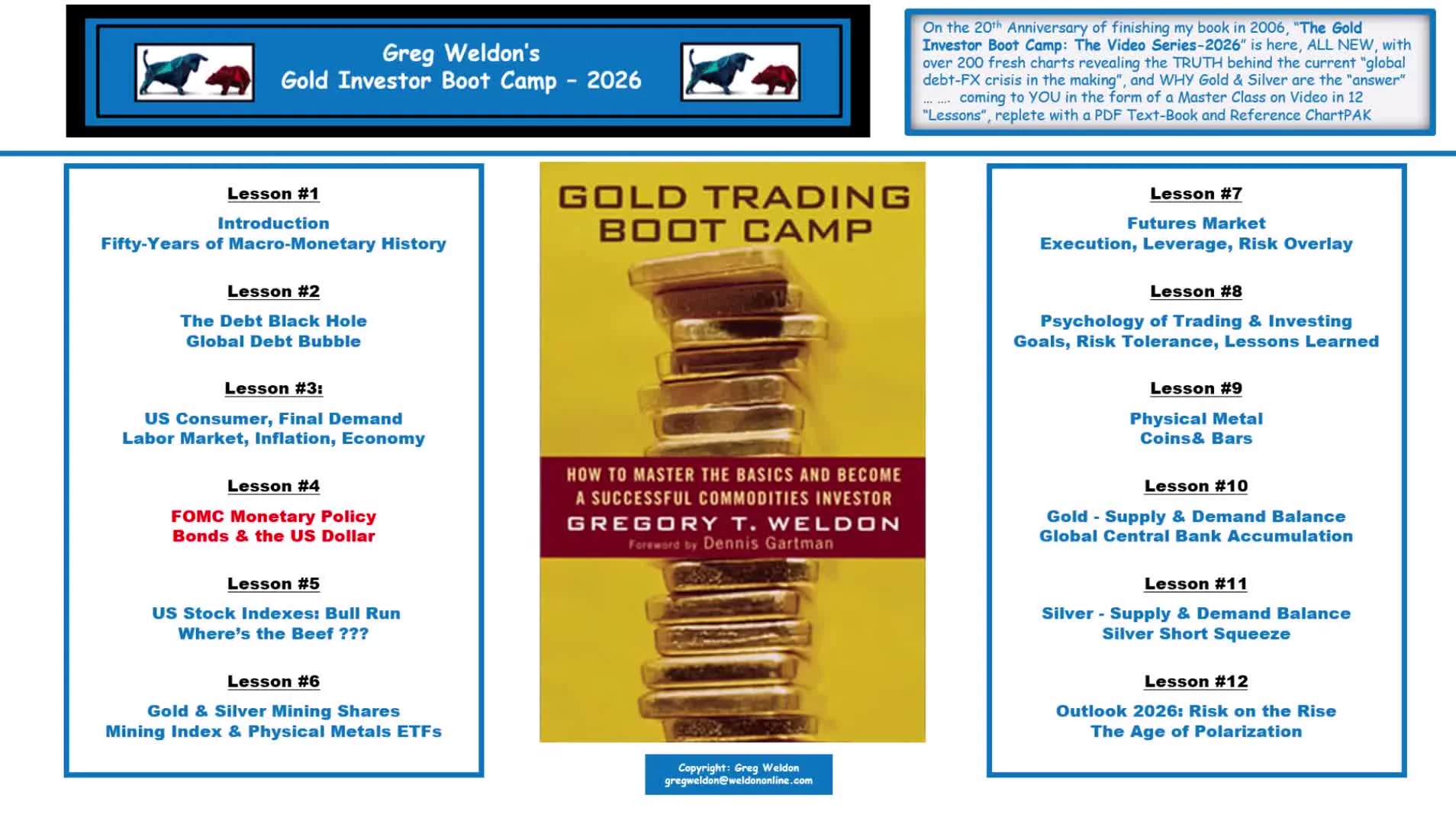 Gold Investor Boot Camp 2026 CLICK-TO-BUY: $29.95 Skip to Videos Preview Preview Boot Camp, • 1/5/26 Boot Camp 2026: Introduction An introduction to Greg Weldon and what his 12-lesson Boot Camp Course will entail Boot Camp, • 1/4/26 Boot Camp: Lesson 1 IntroductionFifty-Years of Macro-Monetary History Boot Camp, • 1/4/26 Boot Camp: Lesson 2 The Debt Black HoleGlobal Debt Bubble Boot Camp, • 1/4/26 Boot Camp: Lesson 3 US Consumer, Final DemandLabor Market, Inflation, Economy Boot Camp, • 1/4/26 Boot Camp: Lesson 4 FOMC Monetary PolicyBonds & the US Dollar Boot Camp, • 1/4/26 Boot Camp: Lesson 5 US Stock Indexes: Bull RunWhere’s the Beef? Boot Camp, • 1/4/26 Boot Camp: Lesson 6 Gold & Silver Mining SharesMining Index & Physical Metals ETFs Boot Camp, • 1/4/26 Boot Camp: Lesson 7 Futures MarketExecution, Leverage, Risk Overlay Boot Camp, • 1/4/26 Boot Camp: Lesson 8 Psychology of Trading & InvestingGoals, Risk Tolerance, Lessons Learned Boot Camp, • 1/4/26 Boot Camp: Lesson 9 Physical MetalCoins & Bars Boot Camp, • 1/4/26 Boot Camp: Lesson 10 Gold - Supply & Demand BalanceGlobal Central Bank Accumulation Boot Camp, • 1/4/26 Boot Camp: Lesson 11 Silver - Supply & Demand BalanceSilver Short Squeeze Boot Camp, • 1/4/26 Boot Camp: Lesson 12 Outlook 2026: Risk on the RiseThe Age of Polarization